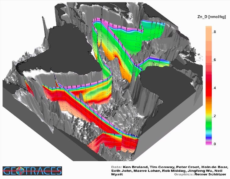 Trace elements can teach us an amazing amount about the oceans. For example, ocean zinc concentrations strikingly resemble the physical properties of deep waters that move huge quantities of heat and nutrients around the planet via the “ocean conveyor belt”. This remarkable link between zinc and ocean circulation is only just beginning to be understood through high-resolution observations and modelling studies.