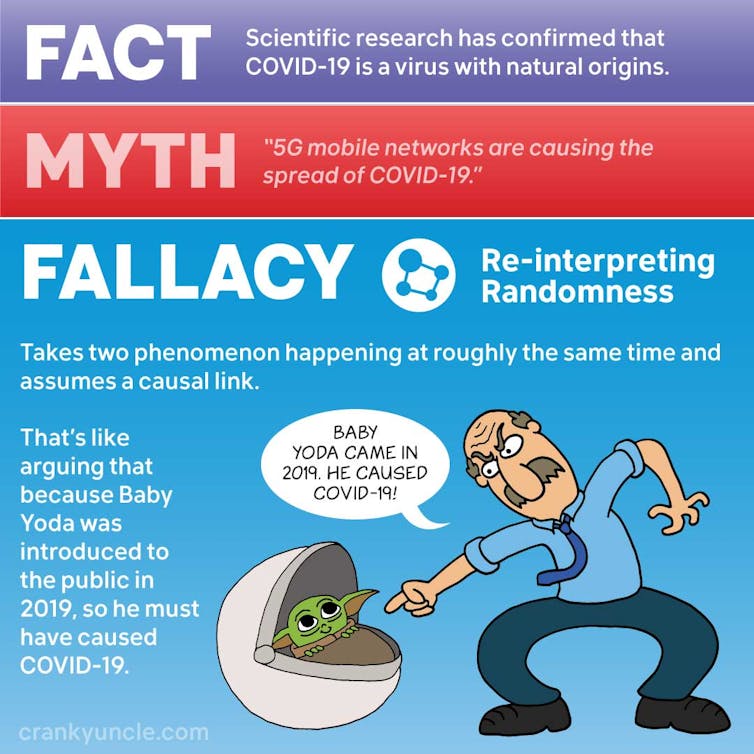 For example, the introduction of 5G in 2019 coincided with the origin of COVID-19 and hence is interpreted to be causally related. But by that logic, other factors that were introduced in 2019 – say, the global phenomenon of Baby Yoda – could also be interpreted as a possible cause of COVID-19.