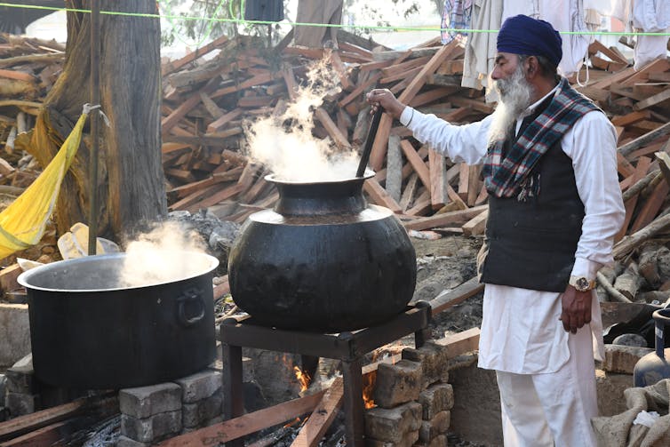 | Striking farmers have been supplying food to hospitals and other people in need during the COVID-19 emergency in India. Credit: EPA-EFE/STR. Source. |